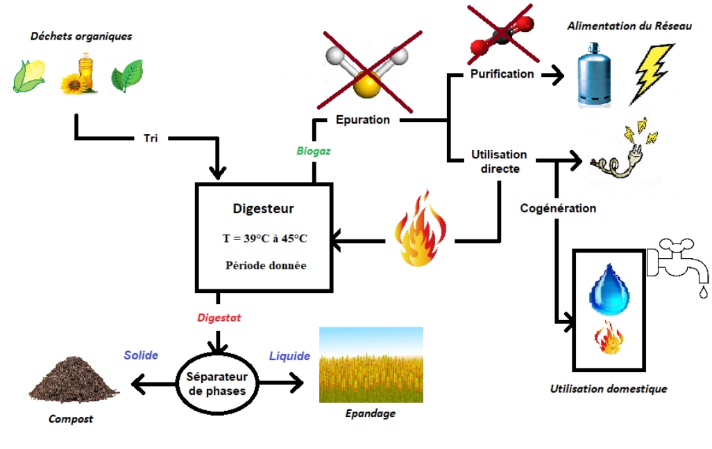 Processus de purification du biogaz et de gestion du digestat pour optimiser leur utilisation.