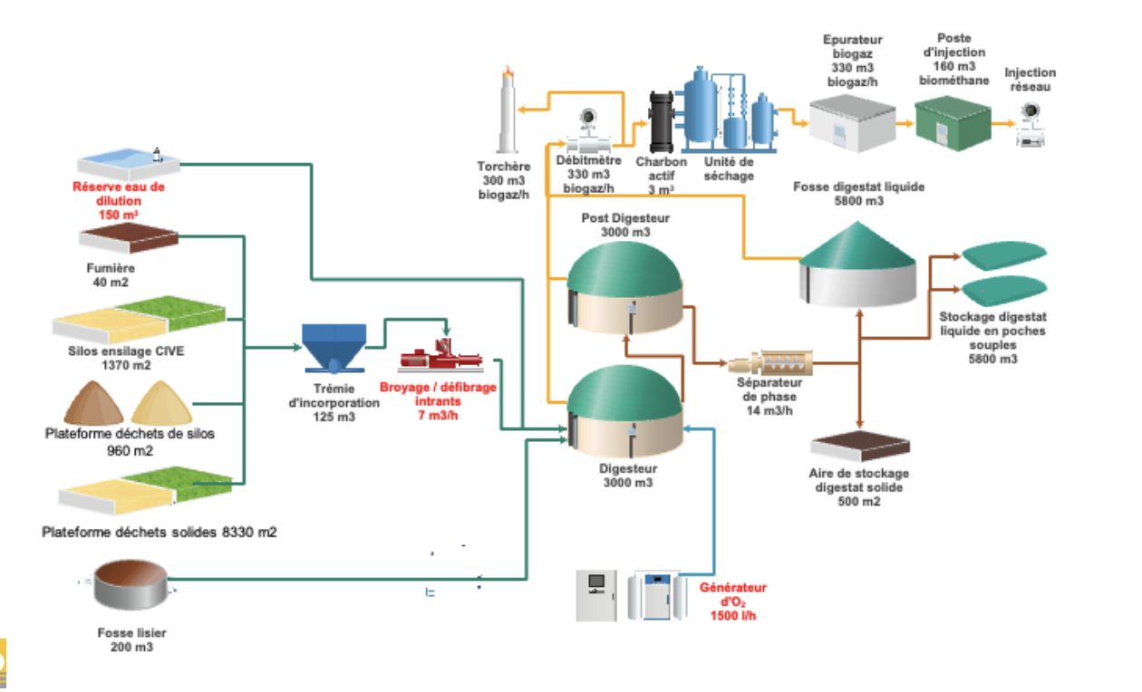 Processus de purification du biogaz et de gestion du digestat pour optimiser leur utilisation.